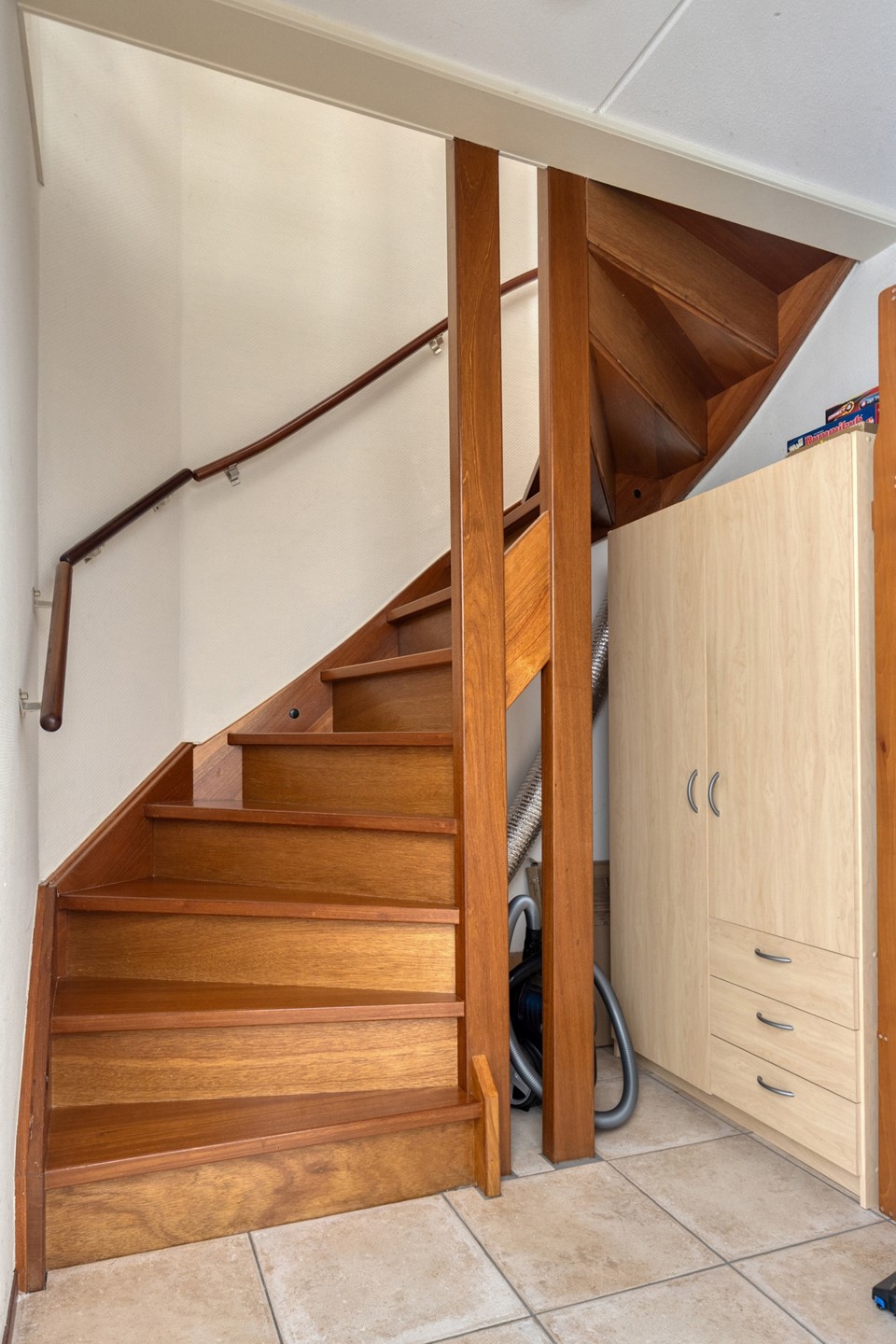 Vanuit de woonkamer komt u in een portaal met de trapopgang naar de eerste verdieping.