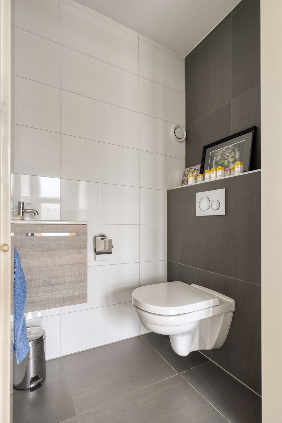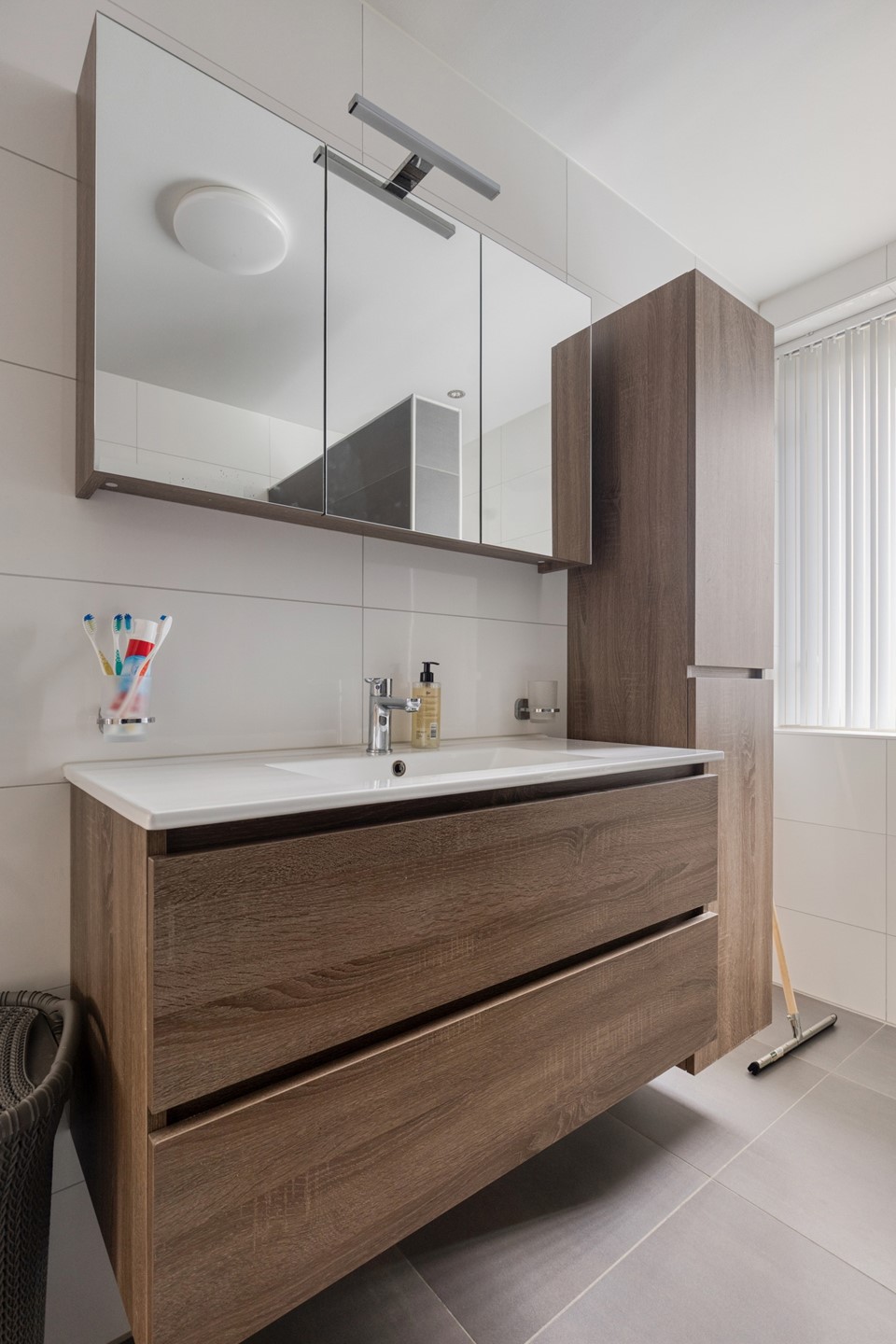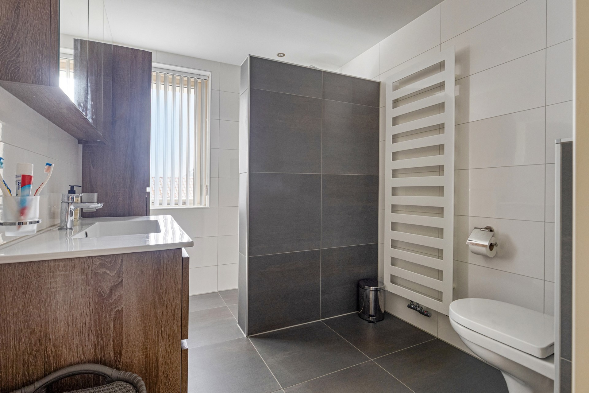 Op de eerste verdieping vindt u 3 ruime slaapkamers. 2 slaapkamers zijn aan de voorzijde gelegen, de derde slaapkamer ligt aan de achterzijde. Eveneens aan de achterzijde van de woning is de badkamer gesitueerd. Deze is compleet uitgevoerd met een wastafelmeubel, inloopdouche (met regendouche) en toilet. De badkamer is -tegelijk met het toilet beneden- in 2021 vernieuwd.