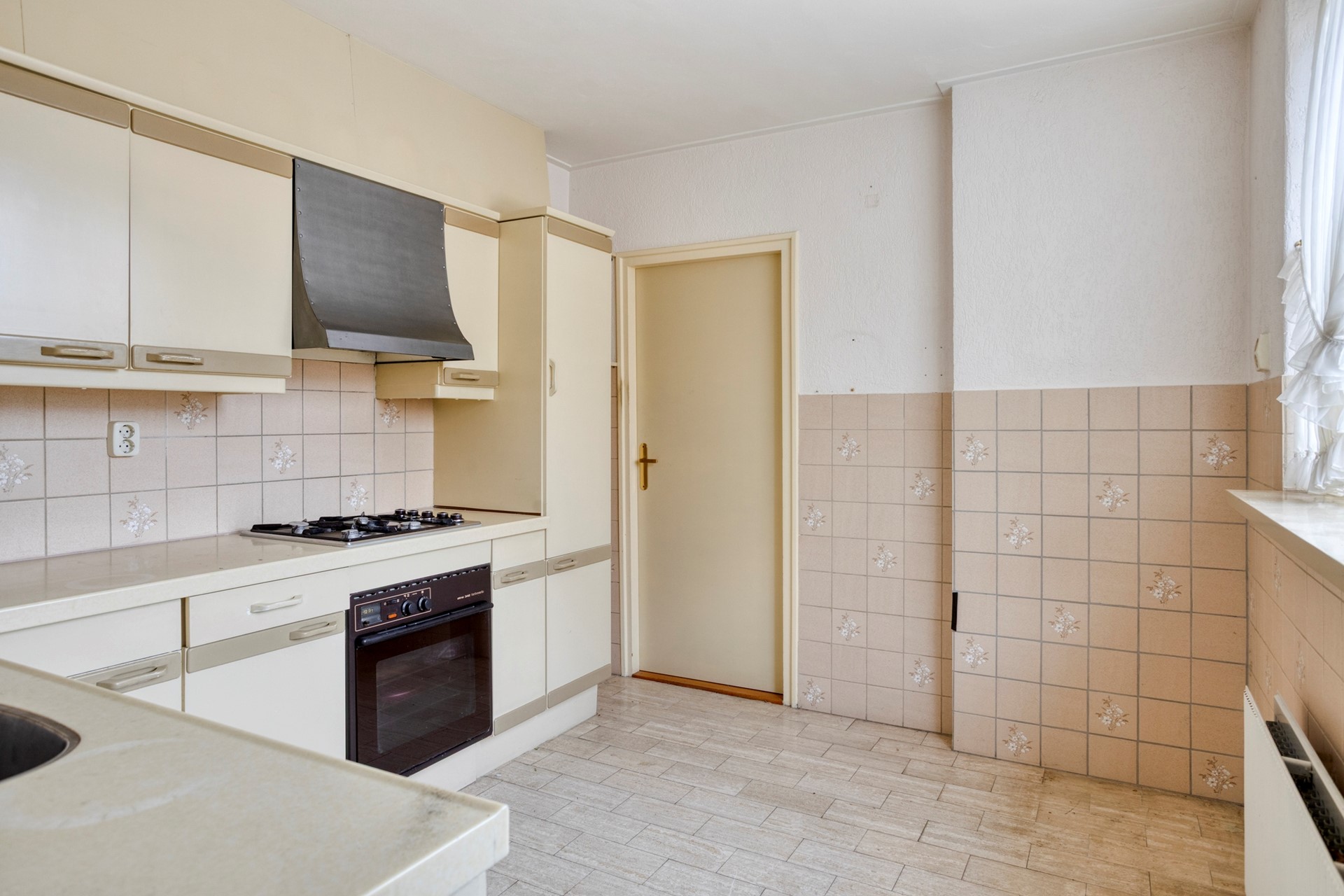 Links vanuit de hal bereikt u de lichte doorzonwoonkamer, met open haard. De dichte keuken is aan de achterzijde van de woning gelegen, grenzend aan de woonkamer. De keuken is eenvoudig van uitvoering en in L-vorm opgesteld.