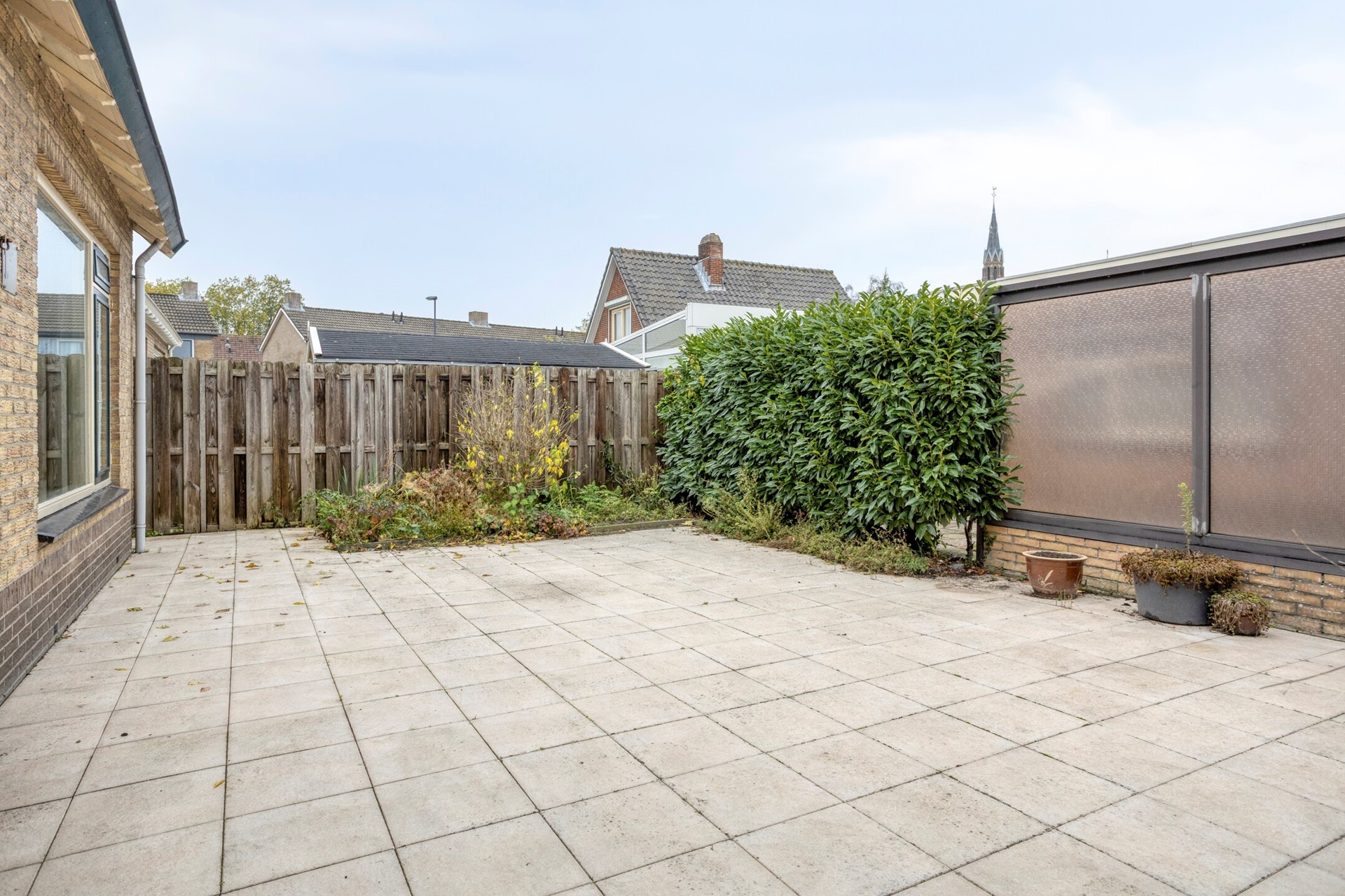 De tuin is onderhoudsvriendelijk aangelegd met een groot terras.