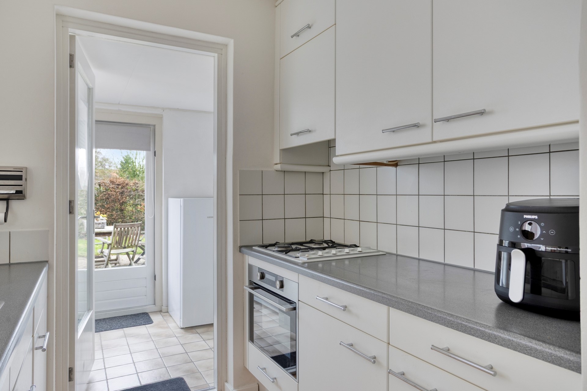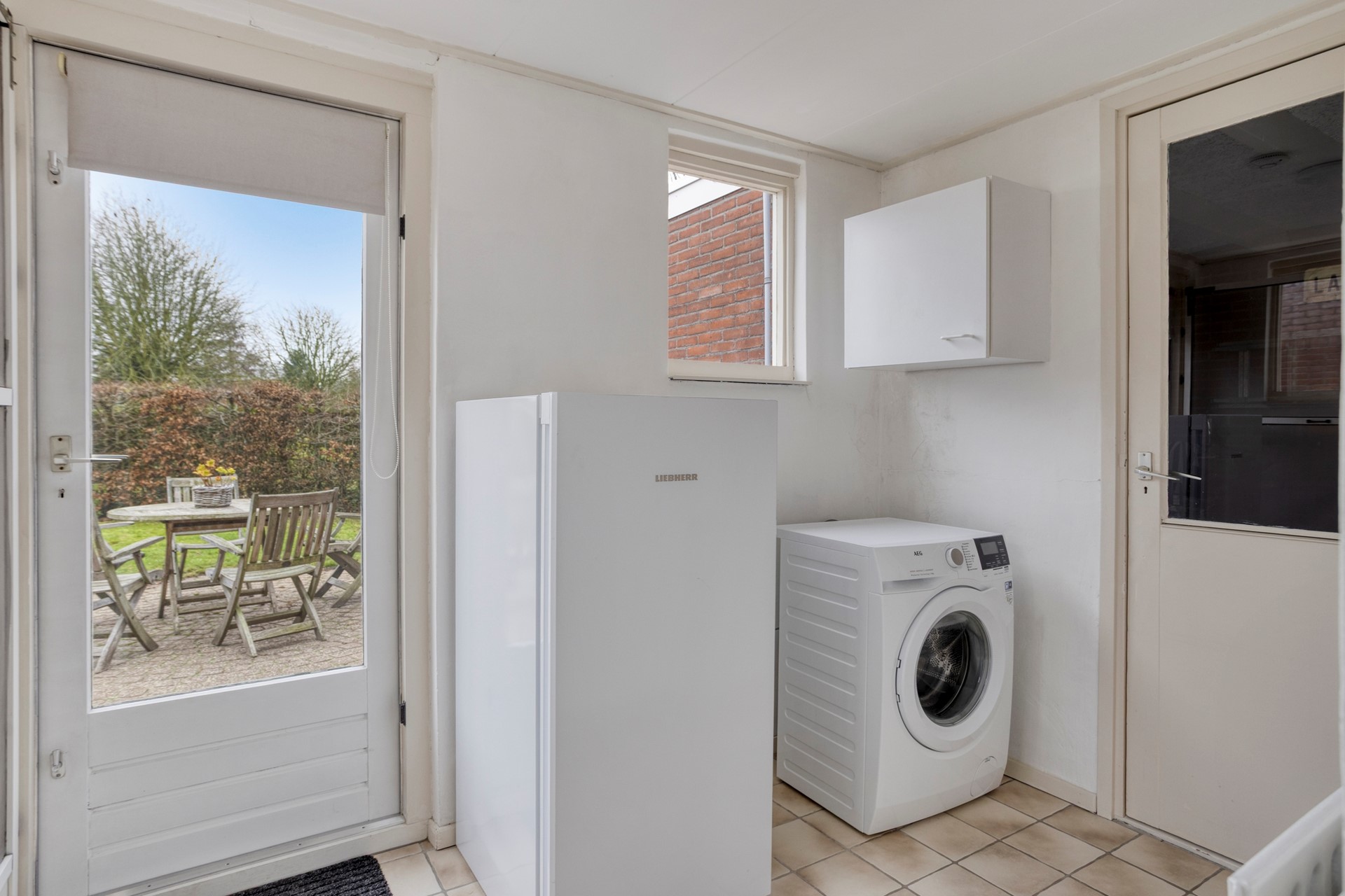 Aansluitend aan de keuken is de praktische bijkeuken, met de witgoedaansluiting. Via de bijkeuken is de garage (in lange uitvoering, 9 meter) toegankelijk.