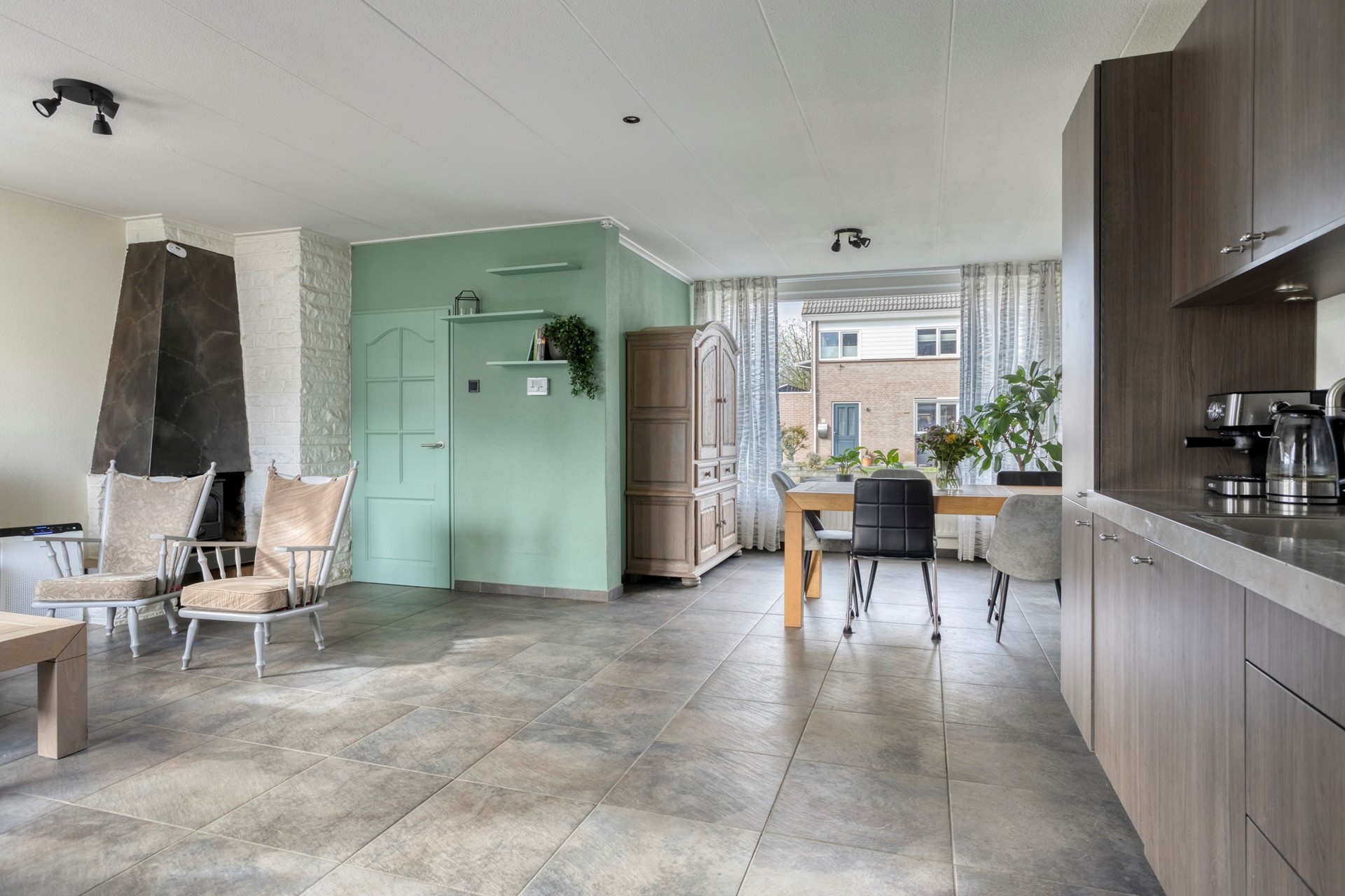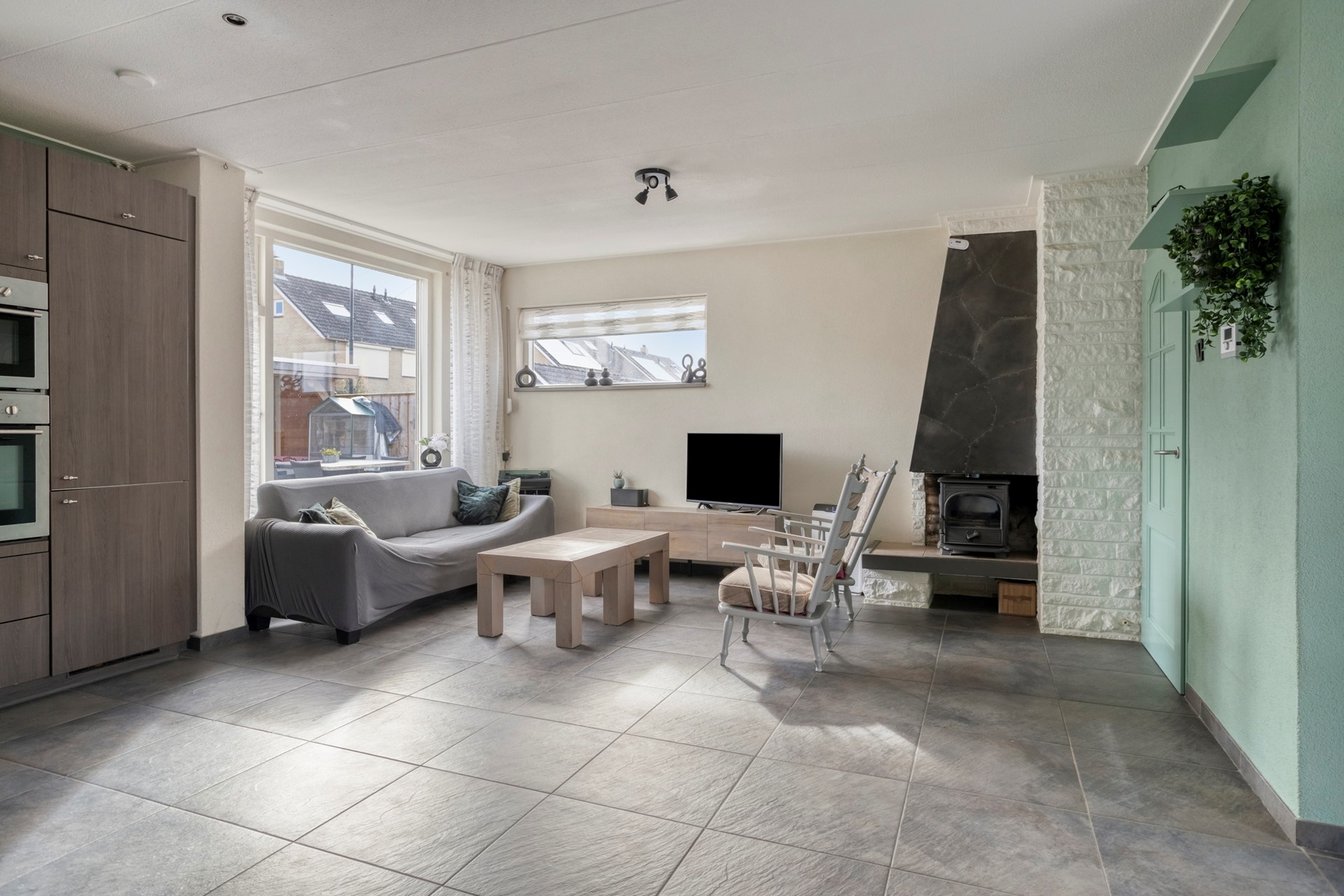 U komt binnen aan de zijkant van de woning, in de hal met toilet, meterkast en trapopgang (met trapkast). Vervolgens komt u in de woonkamer. Deze is ruim en licht door de verschillende raampartijen. De open keuken is aan de achterzijde van de woning gelegen en voorzien van diverse apparatuur.