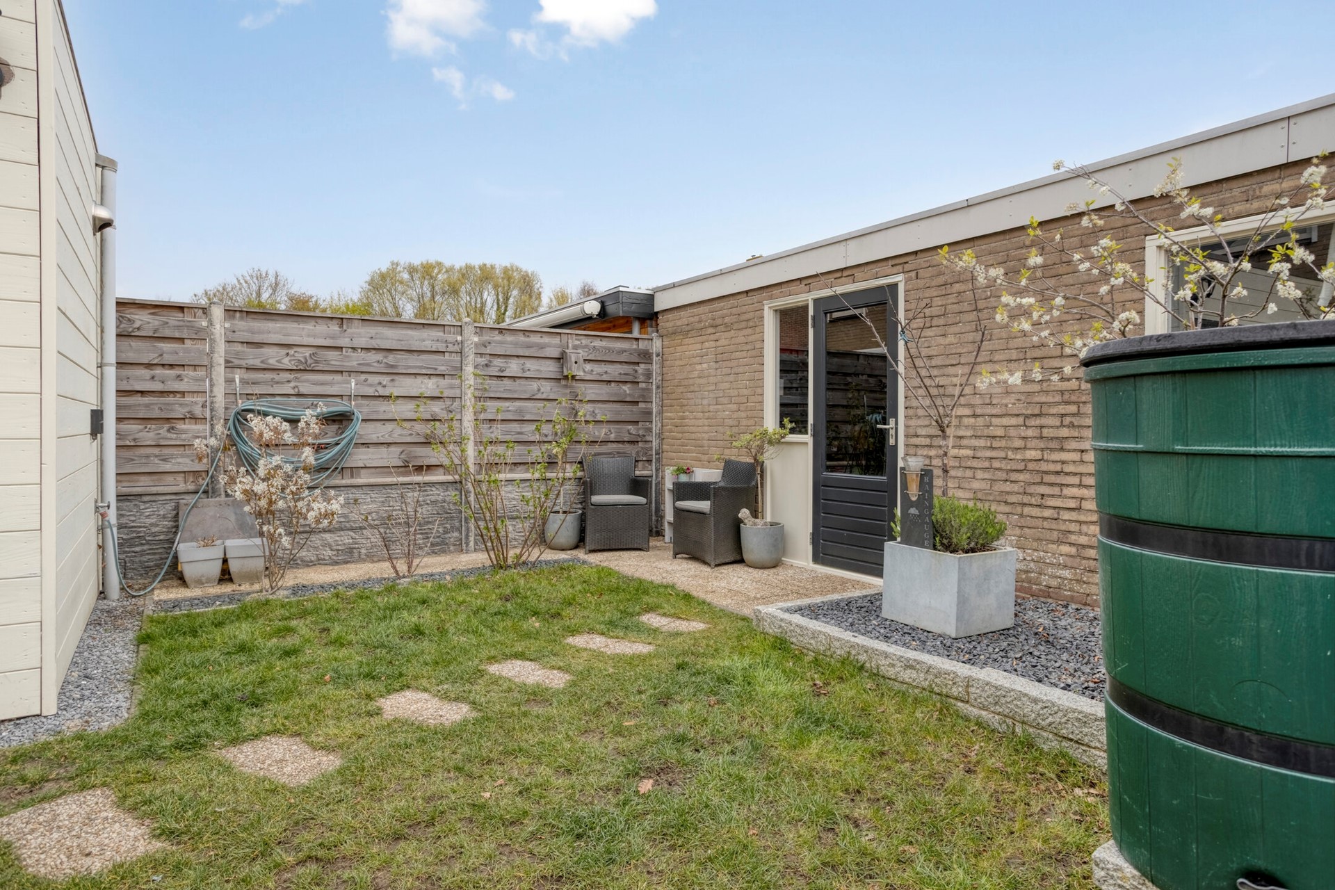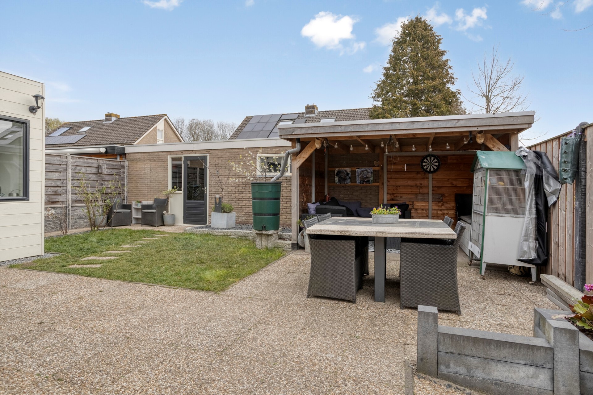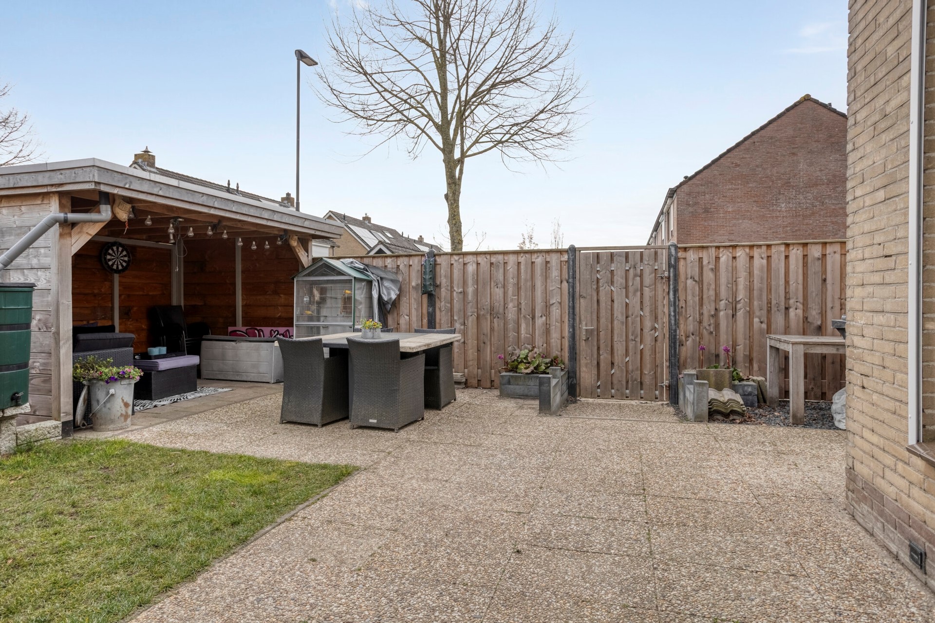 De tuin achter/naast de woning biedt veel mogelijkheden. Deze is nu ingericht met gazon en flink terras. Daarnaast is er een vrijstaande garage, ideaal voor de klusser. Ten slotte is er een veranda/overkapping waaronder het heerlijk vertoeven is.