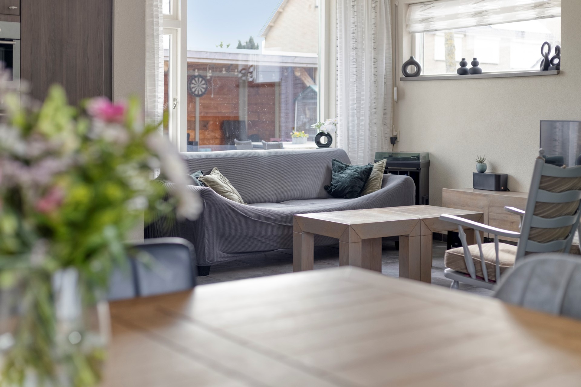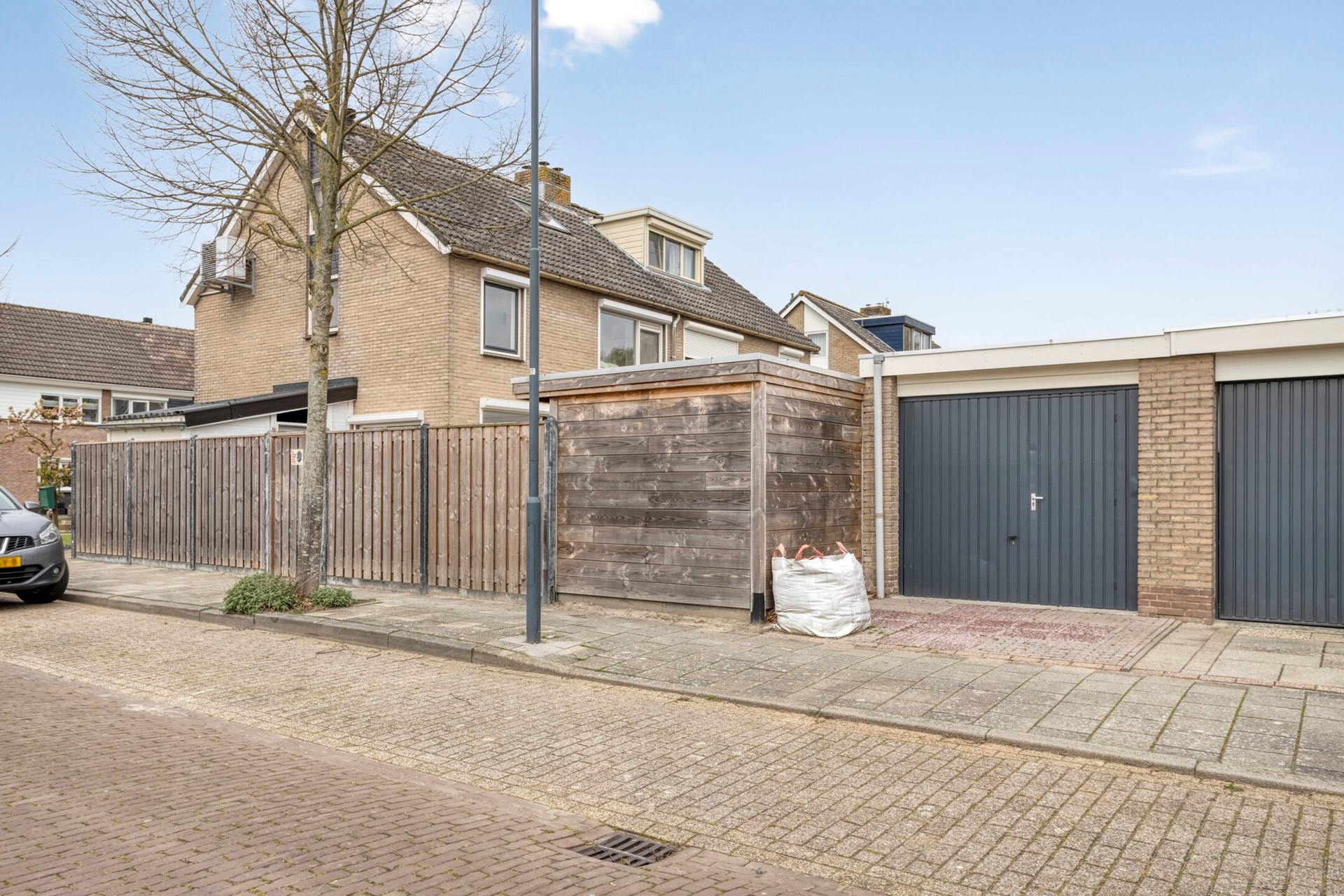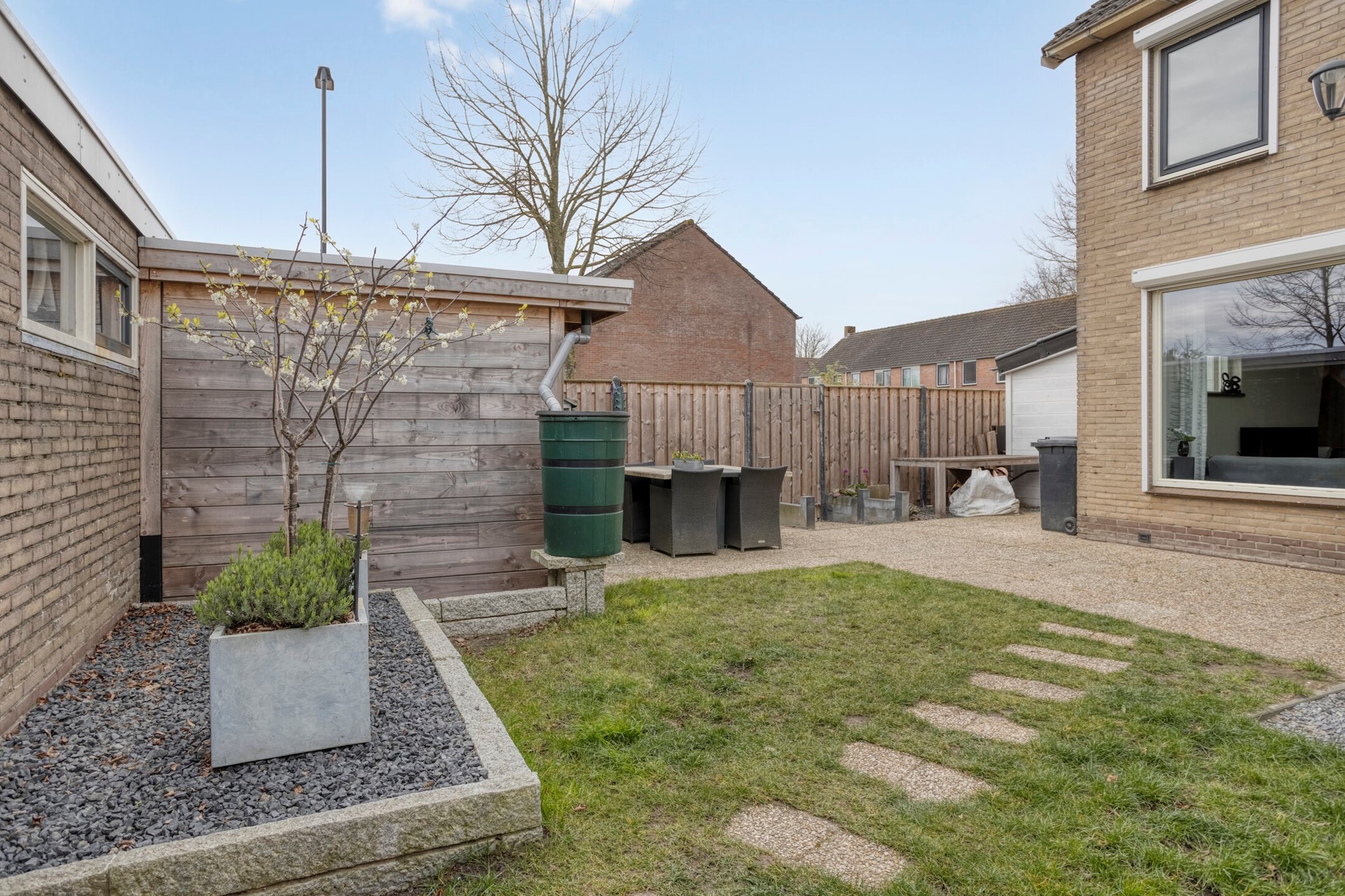 De tuin achter/naast de woning biedt veel mogelijkheden. Deze is nu ingericht met gazon en flink terras. Daarnaast is er een vrijstaande garage, ideaal voor de klusser. Ten slotte is er een veranda/overkapping waaronder het heerlijk vertoeven is.