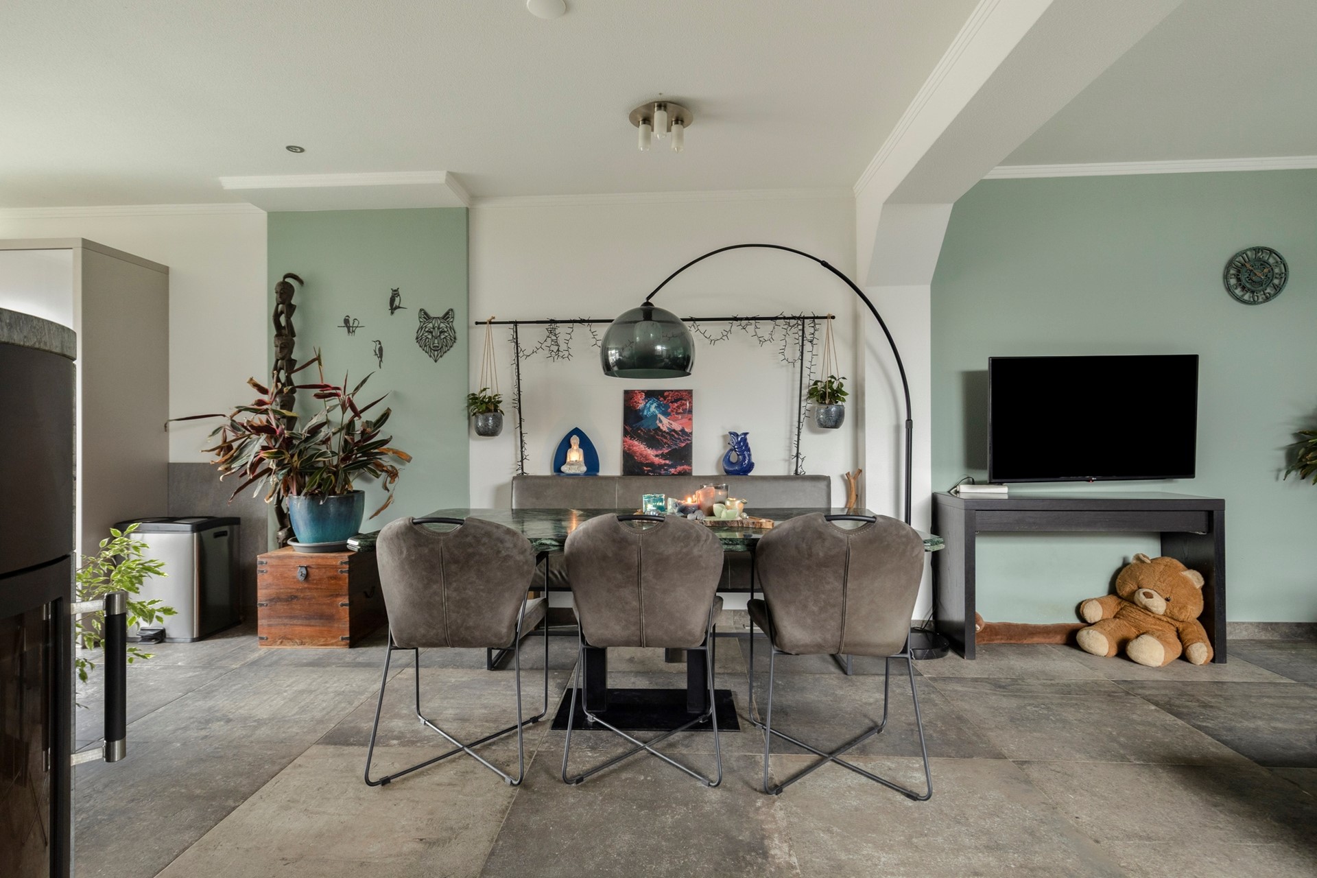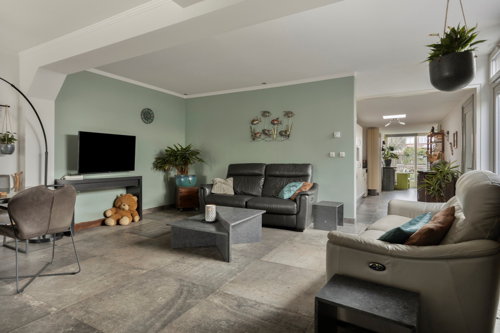 De woonkamer is over de volle breedte van de woning gelegen. Een sfeervolle houtkachel zorgt voor een comfortabele warmte.
