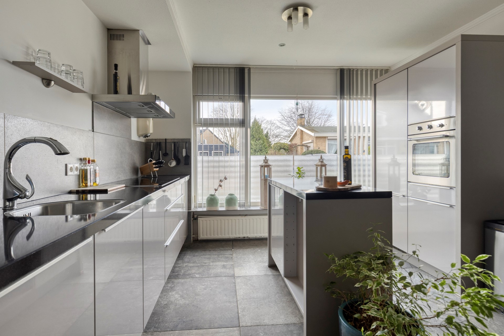 U komt binnen in de hal, met toilet en trapopgang. Vervolgens betreedt u de open keuken. Deze is ruim opgezet en praktisch ingedeeld met het apparatuurgedeelte tegen de ene wand en het spoel- en kookgedeelte tegen de andere wand. In het midden is er nog een werkeiland opgesteld.