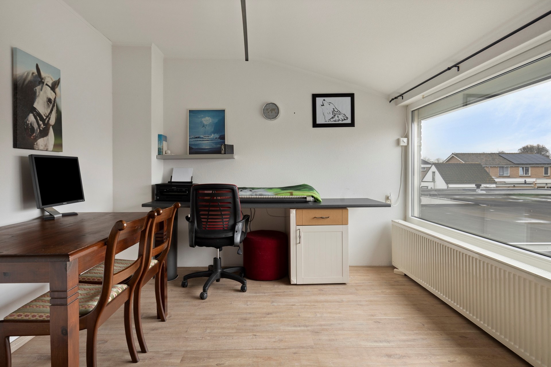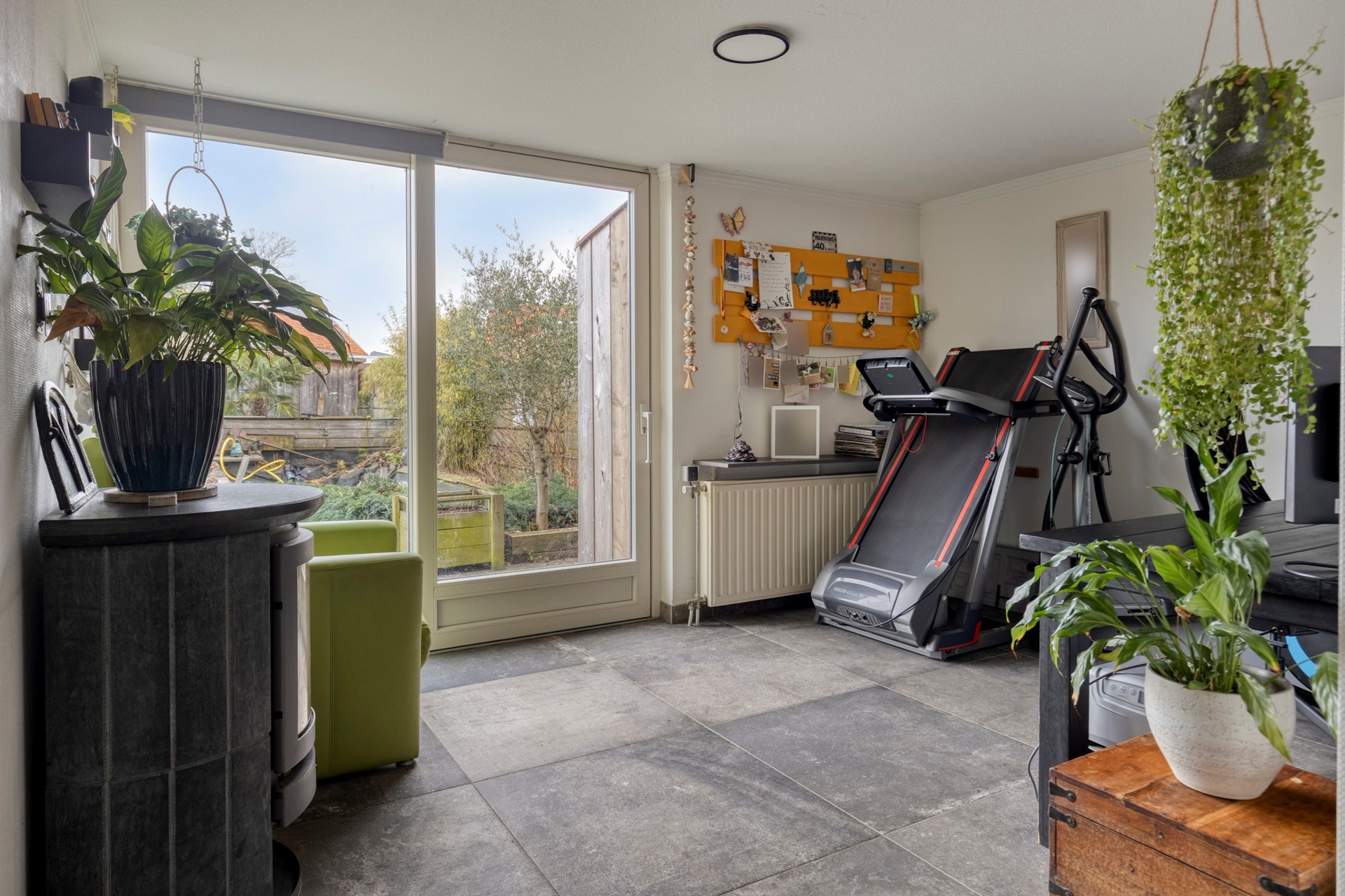 De woonkamer loopt als het ware eigenlijk ongemerkt door in de uitbouw. Deze is ingedeeld met een kantoor-/werkgedeelte. De huidige eigenaar gebruikt het ook als sportruimte. Tevens is het een ideale speelhoek voor (klein)kinderen.