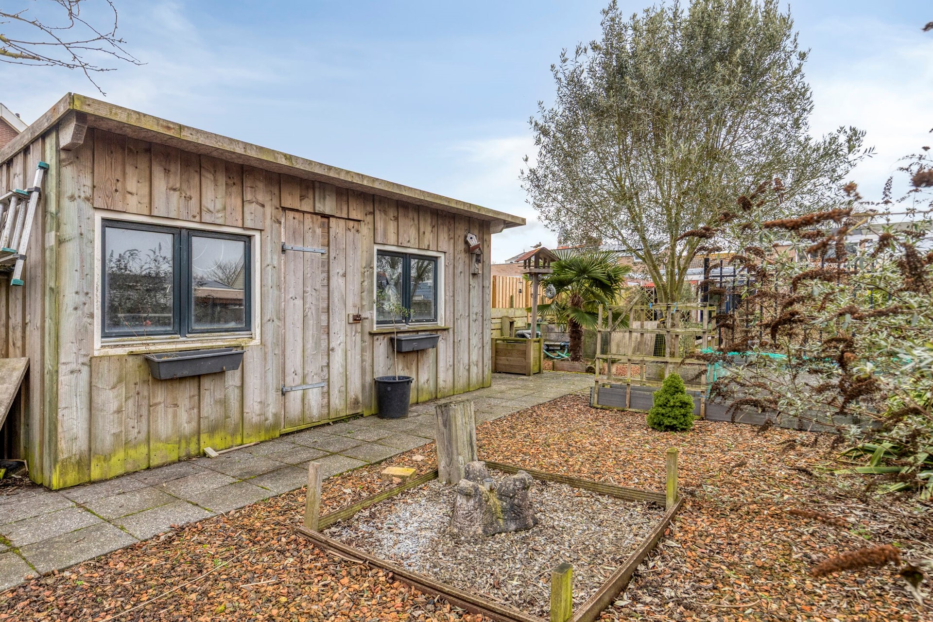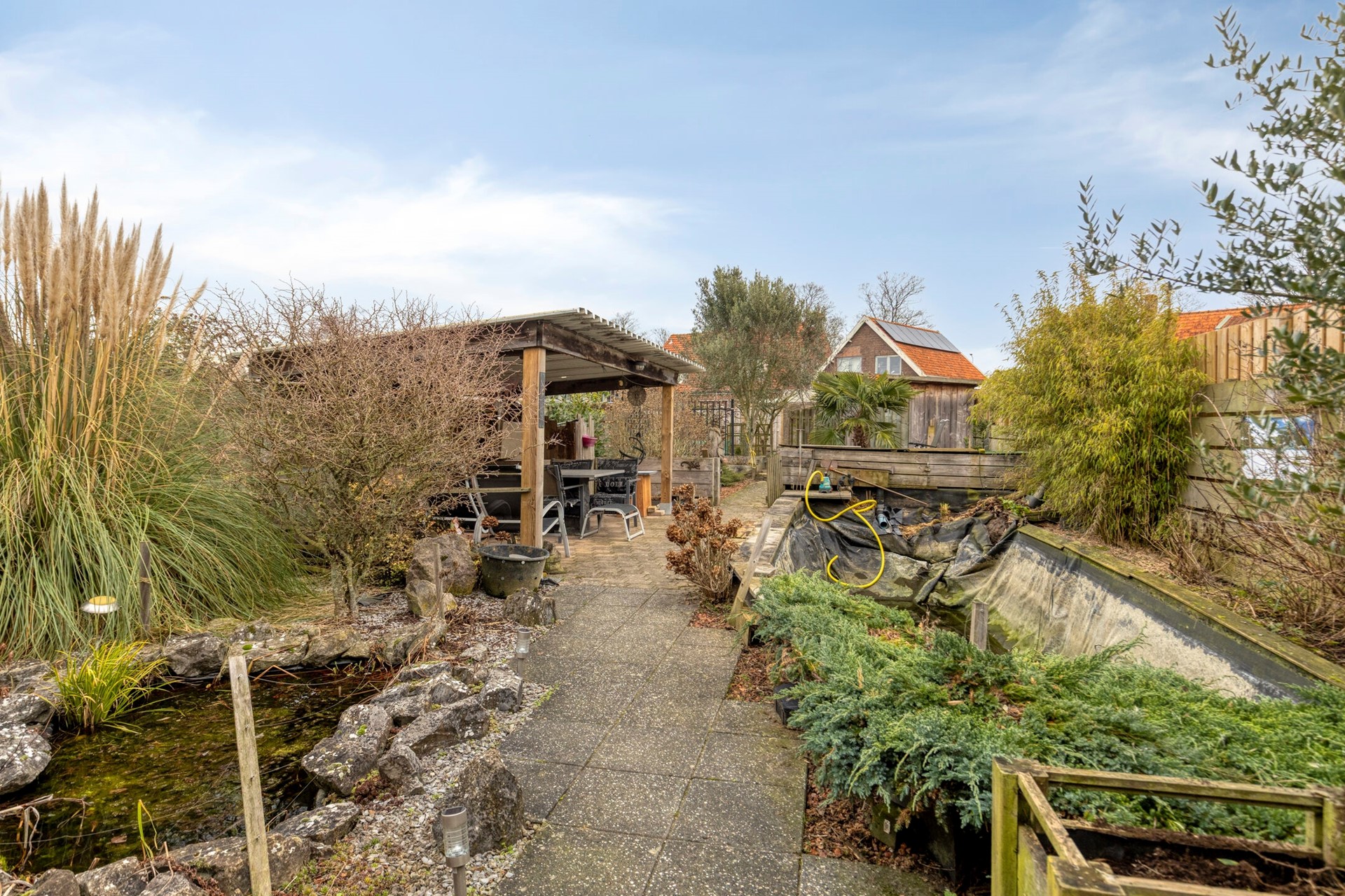 De achtertuin is ruim en diep en op vele manieren in te delen. Nu is de tuin met een grote vijver, borders en terras ingedeeld. Er staat tevens een dubbele schuur in de tuin.