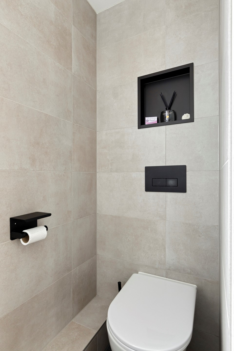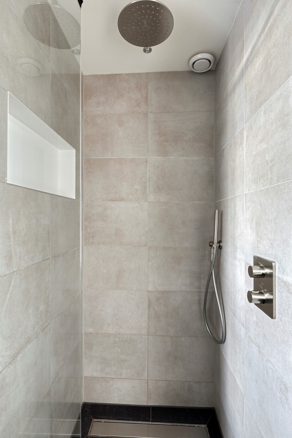 De nette badkamer is recentelijk vernieuwd en compleet uitgevoerd met een douche, dubbele wastafelmeubel en toilet.