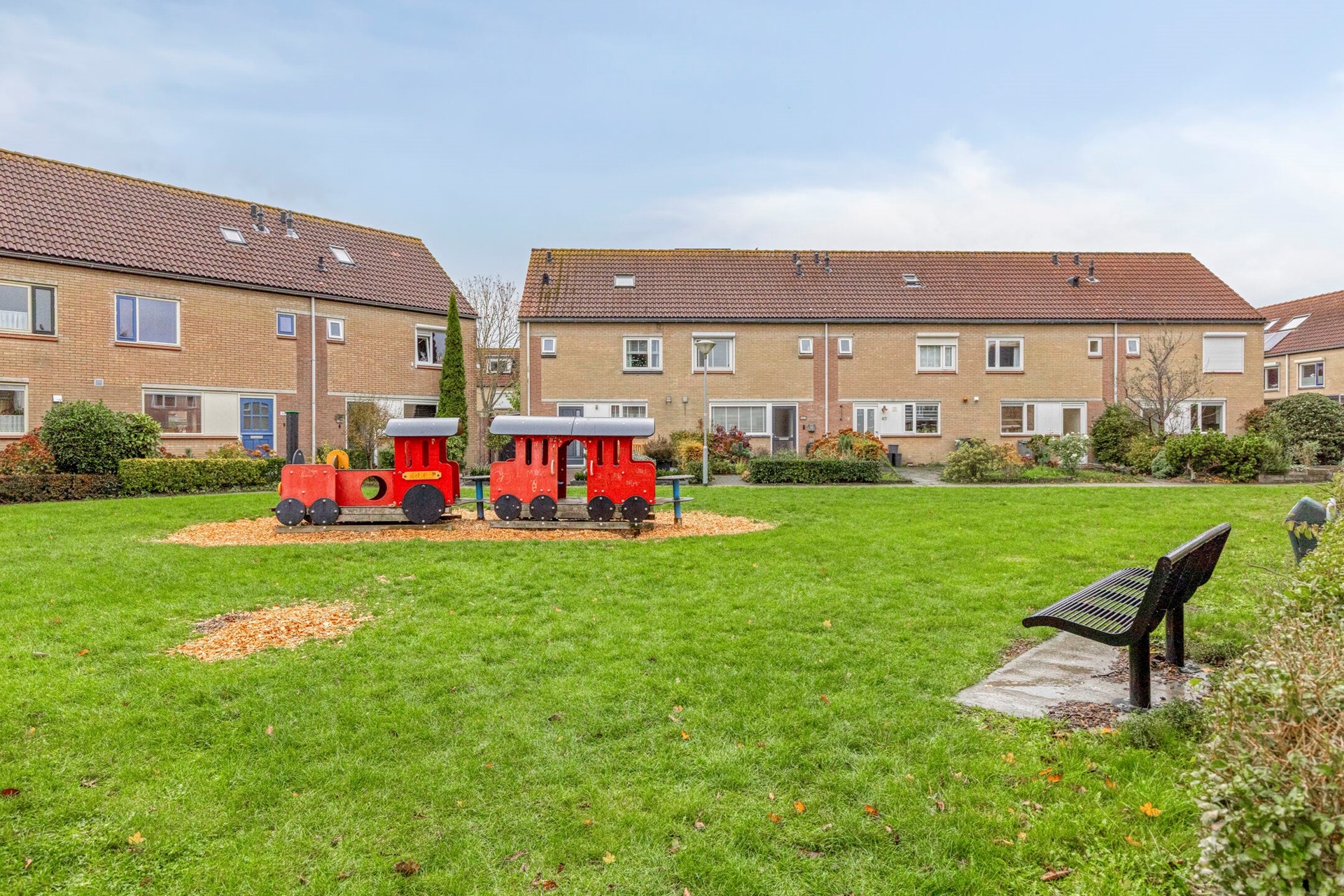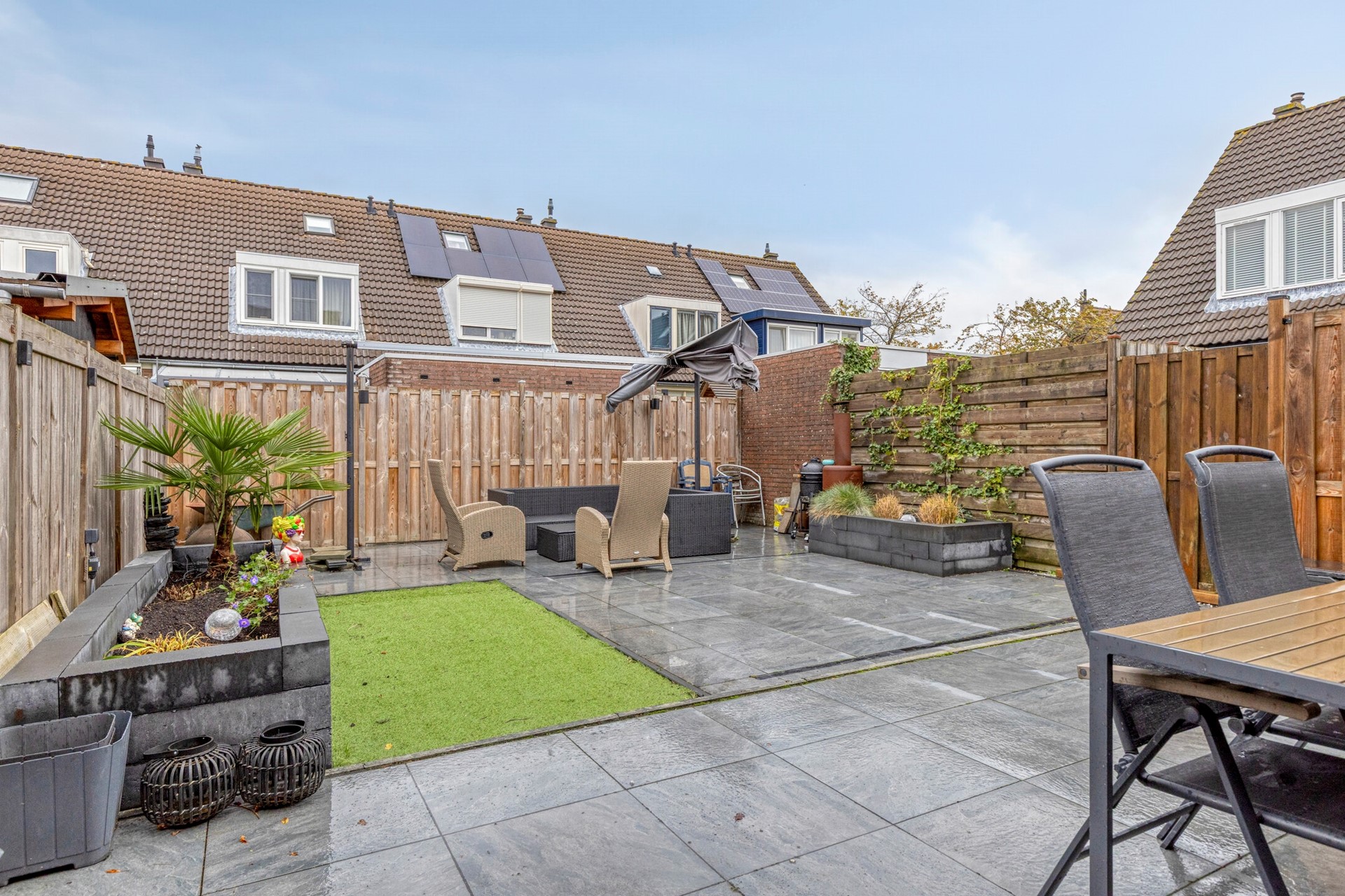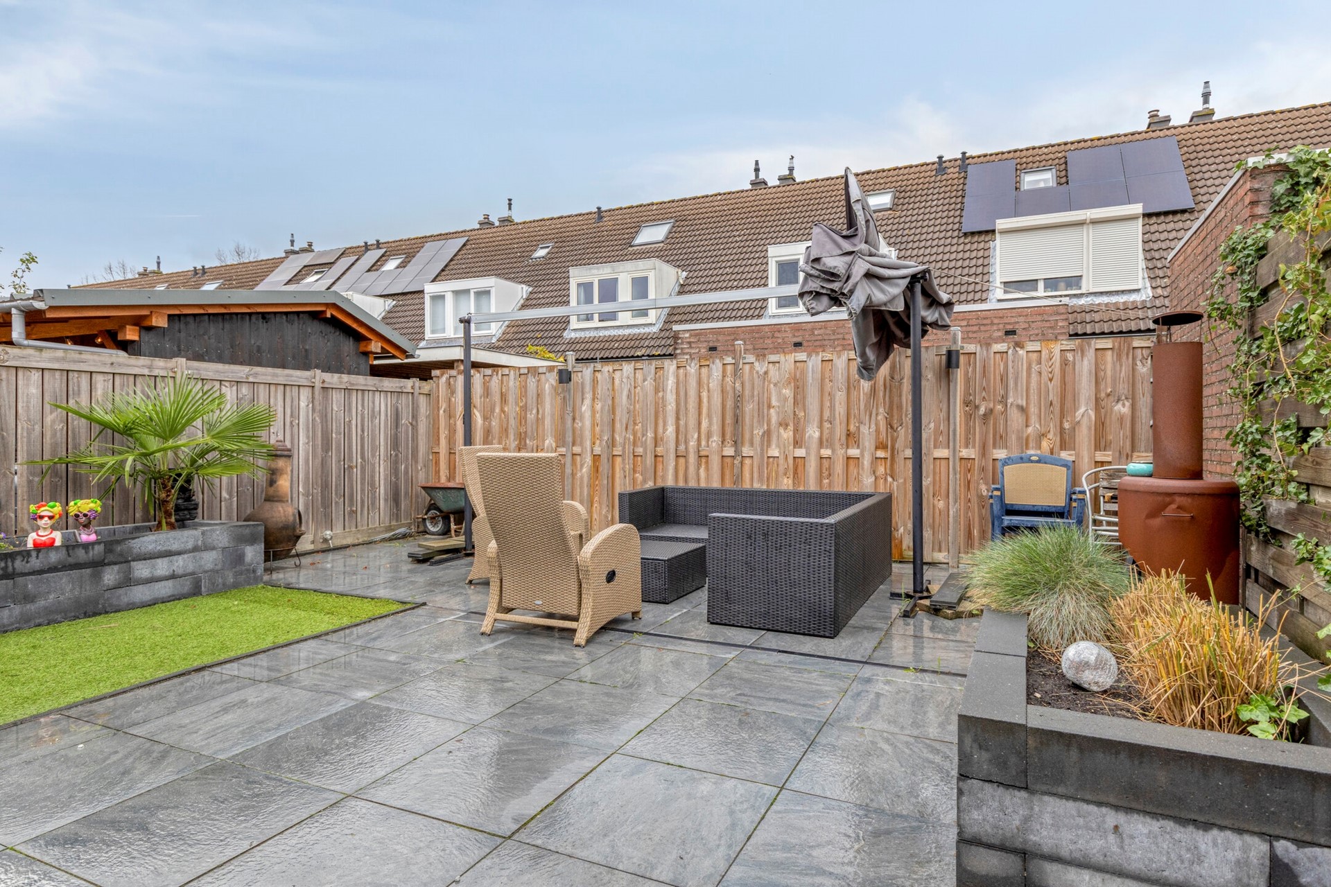 De achtertuin is netjes aangelegd met o.a. een groot terras. Aan de voorzijde is er voldoende parkeergelegenheid, zowel op eigen terrein (1 auto) als in de verschillende parkeerhofjes. Tevens is er een stenen berging voor de woning.